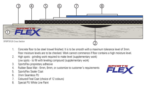 SportsFlex is a fully Malaysian developed product and brand by Sports Tech Pro. The SportsFlex rubberized sports flooring system is specifically designed and engineered for indoor and outdoor sports applications. It is a high performance and multi-purpose sports flooring system that is ideal for futsal pitches, tennis, basketball, badminton, volleyball, multi-purpose halls and street courts. Schools, clubs, universities and all other facilities and arenas can benefit from the use of SportsFlex, which is a non-abrasive and highly recognized sports flooring system. The SportsFlex rubberized sports flooring consists of a consistent rubber base mat that is customizable for thickness. This rubber base mat is bonded to the floor using the proprietary SportsFlex PU adhesive. A high performance Sealer Coat is then applied evenly to the top of the rubber base mat. Next a layer of Seamless PU combined with a Coloured Final Coat is applied. This ensures optimum playability, durability and consistency. Point loads are distributed evenly over a larger area thus minimizing injuries and abrasions. Because SportsFlex is a smooth, flat and non-abrasive surface, it fully complies with the FIFA requirements for futsal. |